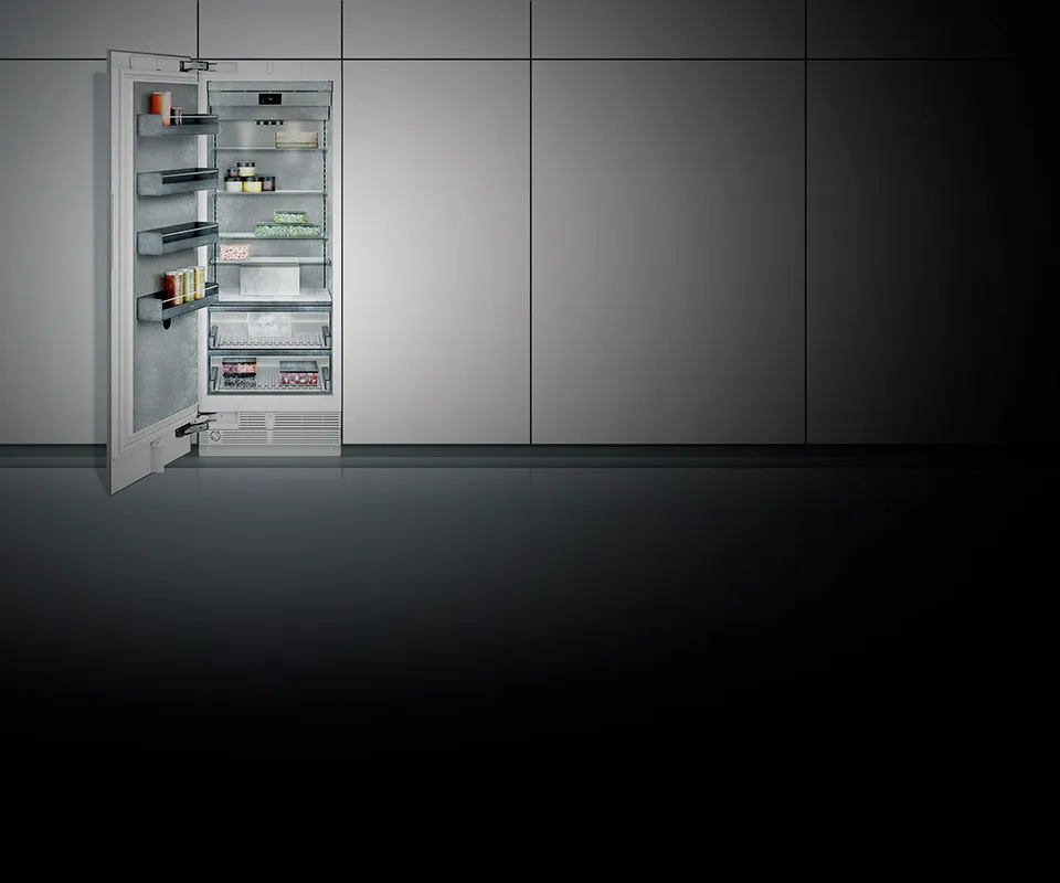 - Ящики в моделях RC and RF расположены на одной высоте. При установке side-by-side стеклянные полки и полки на двери можно установить на одном уровне.
